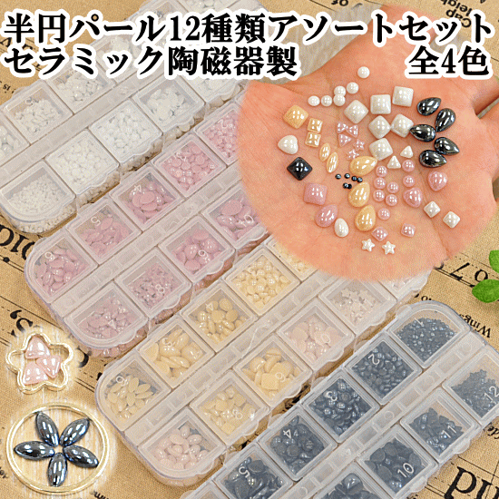 セラミック(陶磁器) 半円パール 12種類 アソートセット(ケース付) 《 ネイルパーツ セラミック 陶磁器製 レジンアクセサリー プチサイズ レジン UVレジン レジン液 uv クラフト レジン液 アクセサリーパーツ 手芸 》