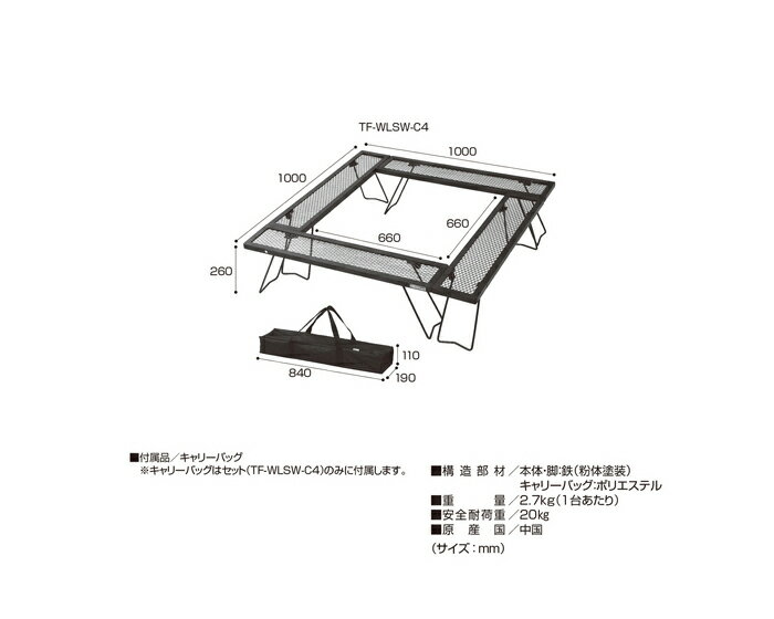 ■寸法/1000×1000×260(h)mm■構造部材/本体・脚:鉄(粉体塗装)■重量/2.7kg(1台あたり)■安全耐荷重/20kg(1台あたり)■付属品/キャリーバッグ【代引きについて】こちらの商品は、代引きでの出荷は受け付けておりません。